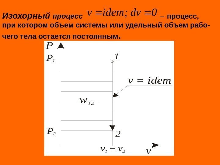Изохорный процесс – процесс, при котором объем системы или удельный объем рабо- чего тела остается постоянным. 0 dv; idemv v 1 2 P = idem w 1, 2 v 1 v 2 P 1 P 2 = v