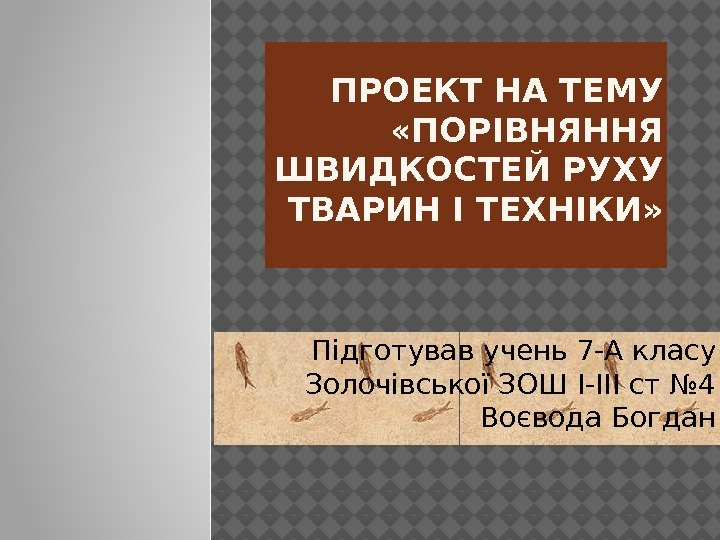 ПРОЕКТ НА ТЕМУ «ПОРІВНЯННЯ ШВИДКОСТЕЙ РУХУ ТВАРИН І ТЕХНІКИ» Підготував учень 7 -А класу Золочівської ЗОШ І-ІІІ ст № 4 Воєвода Богдан
