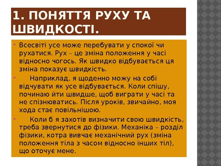 1. ПОНЯТТЯ РУХУ ТА ШВИДКОСТІ. Всесвіті усе може перебувати у спокої чи рухатися. Рух – це зміна положення у часі відносно чогось. Як швидко відбувається ця зміна показує швидкість. Наприклад, я щоденно можу на собі відчувати як усе відбувається. Коли спішу, починаю йти швидше, щоб виграти у часі та не спізнюватись. Після уроків, звичайно, моя хода стає повільнішою. Коли б я захотів визначити свою швидкість, треба звернутися до фізики. Механіка – розділ фізики, котра вивчає механічний рух (зміна положення тіла з часом відносно інших тіл), що оточує мене.