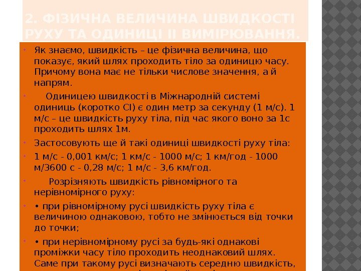 2. ФІЗИЧНА ВЕЛИЧИНА ШВИДКОСТІ РУХУ ТА ОДИНИЦІ ІІ ВИМІРЮВАННЯ. Як знаємо, швидкість – це фізична величина, що показує, який шлях проходить тіло за одиницю часу. Причому вона має не тільки числове значення, а й напрям. Одиницею швидкості в Міжнародній системі одиниць (коротко СІ) є один метр за секунду (1 м/с). 1 м/с – це швидкість руху тіла, під час якого воно за 1 с проходить шлях 1 м. Застосовують ще й такі одиниці швидкості руху тіла: 1 м/с — 0, 001 км/с; 1 км/с — 1000 м/с; 1 км/год — 1000 м/3600 с — 0, 28 м/с; 1 м/с — 3, 6 км/год. Розрізняють швидкість рівномірного та нерівномірного руху: • при рівномірному русі швидкість руху тіла є величиною однаковою, тобто не змінюється від точки до точки; • при нерівномірному русі за будь-які однакові проміжки часу тіло проходить неоднаковий шлях. Саме при такому русі визначають середню швидкість, яка характеризує нерівномірний рух і чисельно дорівнює відношенню всього шляху до часу, за який цей шлях пройдено.
