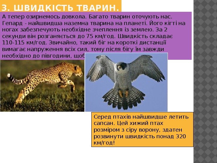 3. ШВИДКІСТЬ ТВАРИН. А тепер озирнемось довкола. Багато тварин оточують нас. Гепард — найшвидша наземна тварина на планеті. Його кігті на ногах забезпечують необхідне зчеплення із землею. За 2 секунди він розганяється до 75 км/год. Швидкість складає 110 -115 км/год. Звичайно, такий біг на короткі дистанції вимагає напруження всіх сил, тому після бігу їм завжди необхідно до півгодини, щоб відпочити. Серед птахів найшвидше летить сапсан. Цей хижий птах розміром з сіру ворону, здатен розвинути швидкість понад 320 км/год!