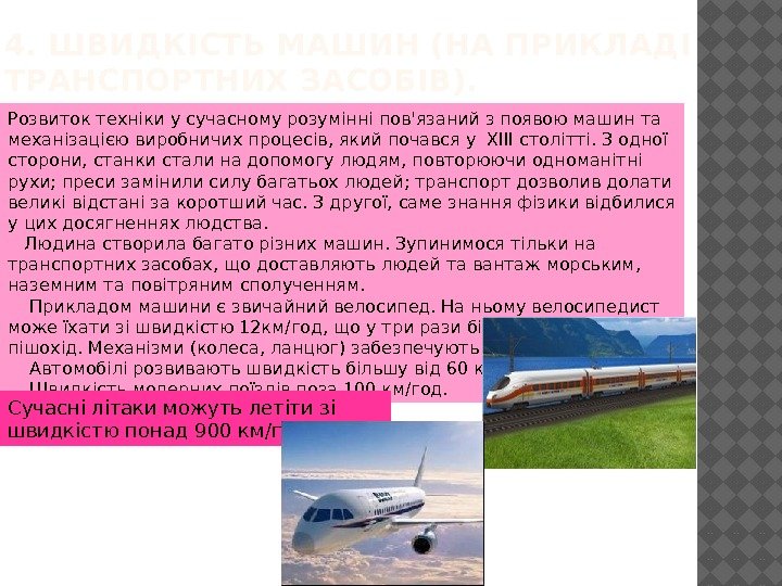 4. ШВИДКІСТЬ МАШИН (НА ПРИКЛАДІ ТРАНСПОРТНИХ ЗАСОБІВ). Розвиток техніки у сучасному розумінні пов’язаний з появою машин та механізацією виробничих процесів, який почався у ХІІІ столітті. З одної сторони, станки стали на допомогу людям, повторюючи одноманітні рухи; преси замінили силу багатьох людей; транспорт дозволив долати великі відстані за коротший час. З другої, саме знання фізики відбилися у цих досягненнях людства. Людина створила багато різних машин. Зупинимося тільки на транспортних засобах, що доставляють людей та вантаж морським, наземним та повітряним сполученням. Прикладом машини є звичайний велосипед. На ньому велосипедист може їхати зі швидкістю 12 км/год, що у три рази більша, ніж коли він пішохід. Механізми (колеса, ланцюг) забезпечують його рух. Автомобілі розвивають швидкість більшу від 60 км/год. Швидкість модерних поїздів поза 100 км/год. Сучасні літаки можуть летіти зі швидкістю понад 900 км/год.