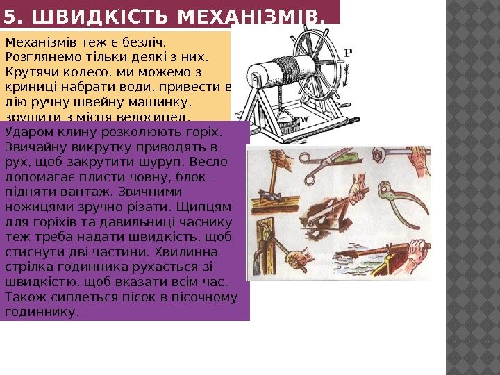 5. ШВИДКІСТЬ МЕХАНІЗМІВ. Механізмів теж є безліч. Розглянемо тільки деякі з них. Крутячи колесо, ми можемо з криниці набрати води, привести в дію ручну швейну машинку, зрушити з місця велосипед. Ударом клину розколюють горіх. Звичайну викрутку приводять в рух, щоб закрутити шуруп. Весло допомагає плисти човну, блок — підняти вантаж. Звичними ножицями зручно різати. Щипцям для горіхів та давильниці часнику теж треба надати швидкість, щоб стиснути дві частини. Хвилинна стрілка годинника рухається зі швидкістю, щоб вказати всім час. Також сиплеться пісок в пісочному годиннику.