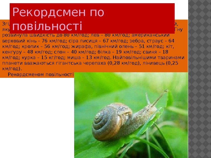 Згідно даних журналу Natural History наведемо приклади швидкостей, яку вимірювали на відстані 500 метрів для деяких тварин. Антилопа Гну розвинула швидкість до 80 км/год; лев – 80 км/год; американський верховий кінь – 76 км/год; сіра лисиця – 67 км/год; зебра, страус – 64 км/год; кролик – 56 км/год; жирафа, північний олень – 51 км/год; кіт, кенгуру – 48 км/год; слон – 40 км/год; білка – 19 км/год; свиня – 18 км/год; курка – 15 кг/год; миша – 13 км/год. Найповільнішими тваринами планети вважаються гігантська черепаха (0, 28 км/год), лінивець (0, 25 км/год). Рекордсменом повільності став равлик (0, 05 км/год)! Рекордсмен по повільності