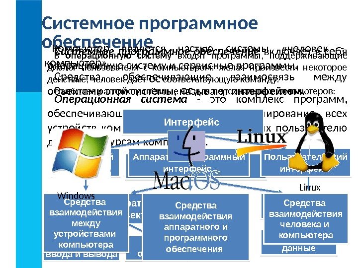 Системное программное обеспечение включает в себя операционную систему и сервисные программы. Операционная система — это комплекс программ, обеспечивающих совместное функционирование всех устройств компьютера и предоставляющих пользователю доступ к ресурсам компьютера. Программные объекты. Аппаратные объекты Компьютер Устройства ввода и вывода Программы и данные. Устройства обработки и хранения. Аппаратный интерфейс Аппаратно-программный интерфейс Пользовательский интерфейс Средства, обеспечивающие взаимосвязь между объектами этой системы, называют интерфейсом. Компьютер является частью системы «человек — компьютер» . Средства взаимодействия человека и компьютера. Средства взаимодействия аппаратного и программного обеспечения Интерфейс Средства взаимодействия между устройствами компьютера. В операционную систему входят программы, поддерживающие диалог пользователя с компьютером: желая произвести некоторое действие, человек даёт ОС соответствующую команду. Наиболее распространённые ОС для персональных компьютеров: Windows Linux
