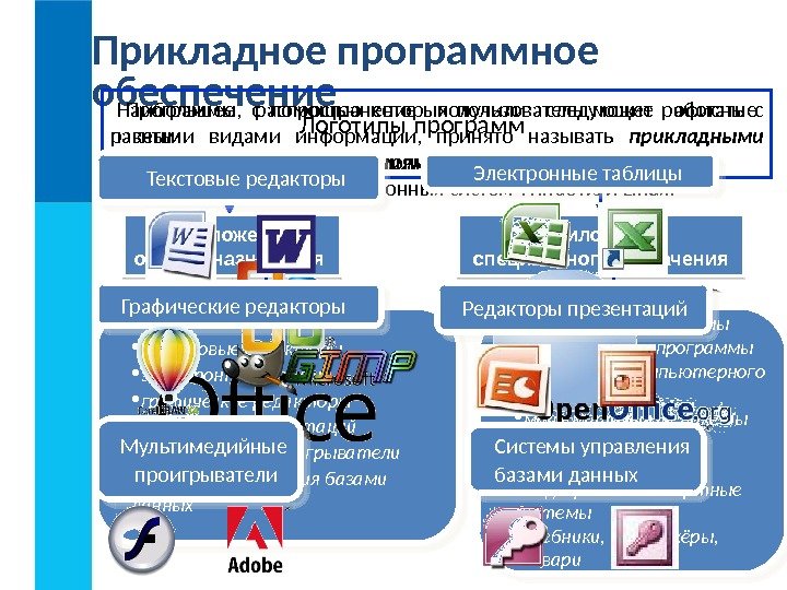 Прикладное программное обеспечение Программы, с помощью которых пользователь может работать с разными видами информации, принято называть прикладными программами или приложениями. • издательские системы • бухгалтерские программы • программы компьютерного моделирования • математические пакеты • геоинформационные системы • медицинские экспертные системы • учебники, тренажёры, словари Приложения специального назначения • текстовые редакторы • электронные таблицы • графические редакторы • редакторы презентаций • мультимедиа проигрыватели • системы управления базами данных Приложения общего назначения Наибольшее распространение получили следующие офисные пакеты: • Microsoft Office для операционных систем Windows и Mac OS; • Open. Office. org для операционных систем Windows и Linux. Редакторы презентаций. Текстовые редакторы Электронные таблицы Графические редакторы Системы управления базами данных. Мультимедийные проигрыватели Логотипы программ