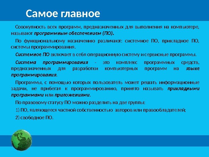 Самое главное Совокупность всех программ, предназначенных для выполнения на компьютере, называют программным обеспечением (ПО). По функциональному назначению различают: системное ПО, прикладное ПО, системы программирования. Системное ПО включает в себя операционную систему и сервисные программы. Система программирования — это комплекс программных средств, предназначенных для разработки компьютерных программ на языке программирования. Программы, с помощью которых пользователь может решать информационные задачи, не прибегая к программированию, принято называть прикладными программами или приложениями. По правовому статусу ПО можно разделить на две группы: 1) ПО, являющееся частной собственностью авторов или правообладателей; 2) свободное ПО.