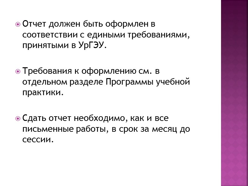 Отчет должен быть оформлен в соответствии с едиными требованиями, принятыми в УрГЭУ. Требования к оформлению см. в отдельном разделе Программы учебной практики. Сдать отчет необходимо, как и все письменные работы, в срок за месяц до сессии.