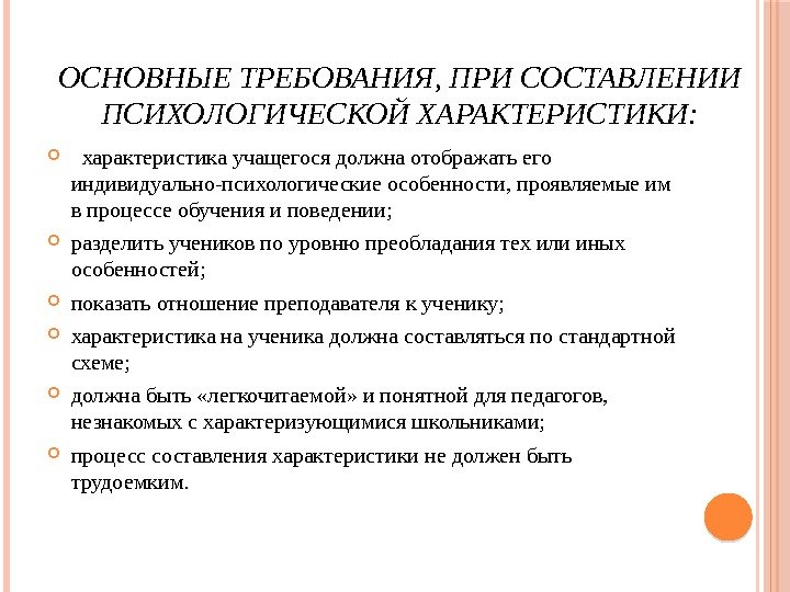 ОСНОВНЫЕ ТРЕБОВАНИЯ, ПРИ СОСТАВЛЕНИИ ПСИХОЛОГИЧЕСКОЙ ХАРАКТЕРИСТИКИ: характеристика учащегося должна отображать его индивидуально-психологические особенности, проявляемые им в процессе обучения и поведении; разделить учеников по уровню преобладания тех или иных особенностей; показать отношение преподавателя к ученику; характеристика на ученика должна составляться по стандартной схеме; должна быть «легкочитаемой» и понятной для педагогов, незнакомых с характеризующимися школьниками; процесс составления характеристики не должен быть трудоемким.