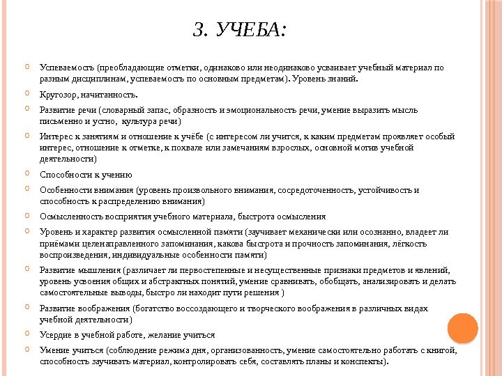 3. УЧЕБА: Успеваемость (преобладающие отметки, одинаково или неодинаково усваивает учебный материал по разным дисциплинам, успеваемость по основным предметам). Уровень знаний. Кругозор, начитанность. Развитие речи (словарный запас, образность и эмоциональность речи, умение выразить мысль письменно и устно, культура речи) Интерес к занятиям и отношение к учёбе (с интересом ли учится, к каким предметам проявляет особый интерес, отношение к отметке, к похвале или замечаниям взрослых, основной мотив учебной деятельности) Способности к учению Особенности внимания (уровень произвольного внимания, сосредоточенность, устойчивость и способность к распределению внимания) Осмысленность восприятия учебного материала, быстрота осмысления Уровень и характер развития осмысленной памяти (заучивает механически или осознанно, владеет ли приёмами целенаправленного запоминания, какова быстрота и прочность запоминания, лёгкость воспроизведения, индивидуальные особенности памяти) Развитие мышления (различает ли первостепенные и несущественные признаки предметов и явлений, уровень усвоения общих и абстрактных понятий, умение сравнивать, обобщать, анализировать и делать самостоятельные выводы, быстро ли находит пути решения ) Развитие воображения (богатство воссоздающего и творческого воображения в различных видах учебной деятельности) Усердие в учебной работе, желание учиться Умение учиться (соблюдение режима дня, организованность, умение самостоятельно работать с книгой, способность заучивать материал, контролировать себя, составлять планы и конспекты).