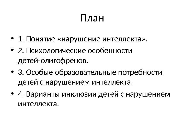 План • 1. Понятие «нарушение интеллекта» . • 2. Психологические особенности детей-олигофренов. • 3. Особые образовательные потребности детей с нарушением интеллекта. • 4. Варианты инклюзии детей с нарушением интеллекта.