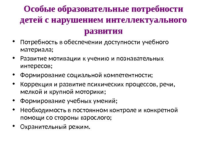 Особые образовательные потребности детей с нарушением интеллектуального развития • Потребность в обеспечении доступности учебного материала; • Развитие мотивации к учению и познавательных интересов; • Формирование социальной компетентности; • Коррекция и развитие психических процессов, речи, мелкой и крупной моторики; • Формирование учебных умений; • Необходимость в постоянном контроле и конкретной помощи со стороны взрослого; • Охранительный режим.