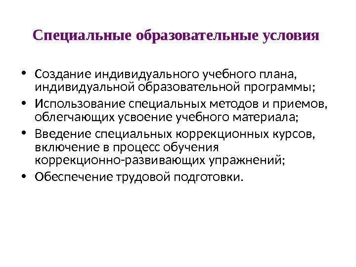 Специальные образовательные условия • Создание индивидуального учебного плана, индивидуальной образовательной программы; • Использование специальных методов и приемов, облегчающих усвоение учебного материала; • Введение специальных коррекционных курсов, включение в процесс обучения коррекционно-развивающих упражнений; • Обеспечение трудовой подготовки.