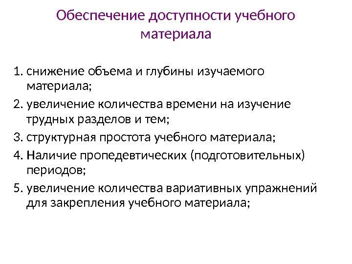 Обеспечение доступности учебного материала 1. снижение объема и глубины изучаемого материала; 2. увеличение количества времени на изучение трудных разделов и тем; 3. структурная простота учебного материала; 4. Наличие пропедевтических (подготовительных) периодов; 5. увеличение количества вариативных упражнений для закрепления учебного материала;