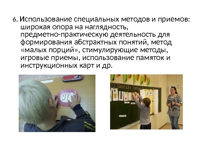 6. Использование специальных методов и приемов: широкая опора на наглядность, предметно-практическую деятельность для формирования абстрактных понятий, метод «малых порций» , стимулирующие методы, игровые приемы, использование памяток и инструкционных карт и др.
