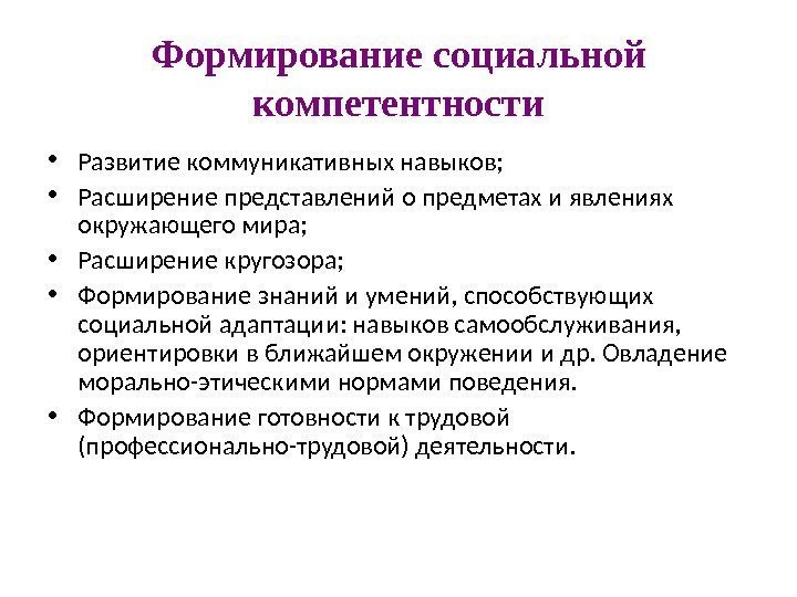Формирование социальной компетентности • Развитие коммуникативных навыков; • Расширение представлений о предметах и явлениях окружающего мира; • Расширение кругозора; • Формирование знаний и умений, способствующих социальной адаптации: навыков самообслуживания, ориентировки в ближайшем окружении и др. Овладение морально-этическими нормами поведения. • Формирование готовности к трудовой (профессионально-трудовой) деятельности.