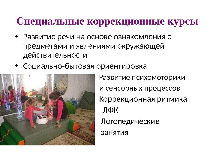Специальные коррекционные курсы • Развитие речи на основе ознакомления с предметами и явлениями окружающей действительности • Социально-бытовая ориентировка Развитие психомоторики и сенсорных процессов Коррекционная ритмика ЛФК Логопедические занятия