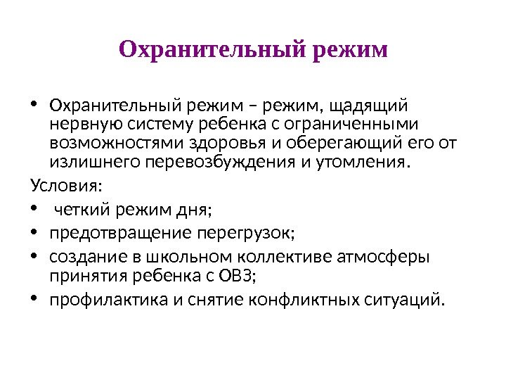 Охранительный режим • Охранительный режим – режим, щадящий нервную систему ребенка с ограниченными возможностями здоровья и оберегающий его от излишнего перевозбуждения и утомления. Условия: • четкий режим дня; • предотвращение перегрузок; • создание в школьном коллективе атмосферы принятия ребенка с ОВЗ; • профилактика и снятие конфликтных ситуаций.