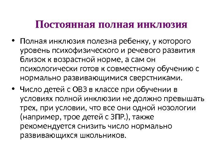 Постоянная полная инклюзия • Полная инклюзия полезна ребенку, у которого уровень психофизического и речевого развития близок к возрастной норме, а сам он психологически готов к совместному обучению с нормально развивающимися сверстниками. • Число детей с ОВЗ в классе при обучении в условиях полной инклюзии не должно превышать трех, при условии, что все они одной нозологии (например, трое детей с ЗПР. ), также рекомендуется снизить число нормально развивающихся школьников.