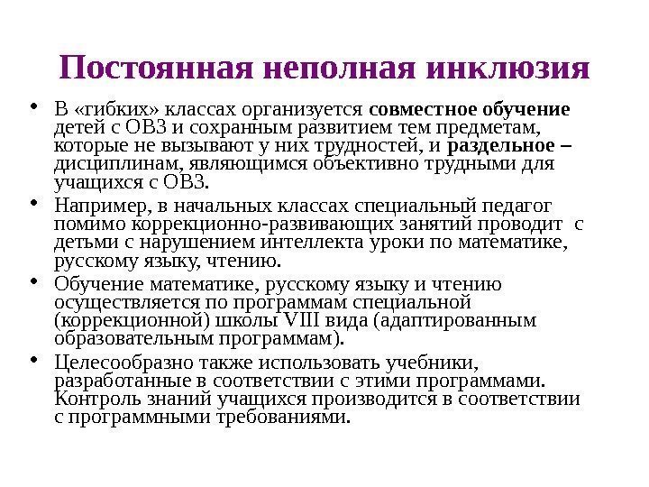 Постоянная неполная инклюзия • В «гибких» классах организуется совместное обучение детей с ОВЗ и сохранным развитием тем предметам, которые не вызывают у них трудностей, и раздельное – дисциплинам, являющимся объективно трудными для учащихся с ОВЗ. • Например, в начальных классах специальный педагог помимо коррекционно-развивающих занятий проводит с детьми с нарушением интеллекта уроки по математике, русскому языку, чтению. • Обучение математике, русскому языку и чтению осуществляется по программам специальной (коррекционной) школы VIII вида (адаптированным образовательным программам). • Целесообразно также использовать учебники, разработанные в соответствии с этими программами. Контроль знаний учащихся производится в соответствии с программными требованиями.