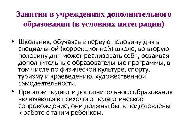 Занятия в учреждениях дополнительного образования (в условиях интеграции) • Школьник, обучаясь в первую половину дня в специальной (коррекционной) школе, во вторую половину дня может реализовать себя, осваивая дополнительные образовательные программы, в том числе по физической культуре, спорту, туризму и краеведению, художественной самодеятельности. • При этом педагоги дополнительного образования включаются в психолого-педагогическое сопровождение, они должны быть подготовлены к работе с таким ребенком.