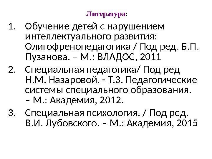 Литература : 1. Обучение детей с нарушением интеллектуального развития: Олигофренопедагогика / Под ред. Б. П. Пузанова. – М. : ВЛАДОС, 2011 2. Специальная педагогика/ Под ред Н. М. Назаровой. — Т. 3. Педагогические системы специального образования. – М. : Академия, 2012. 3. Специальная психология. / Под ред. В. И. Лубовского. – М. : Академия,