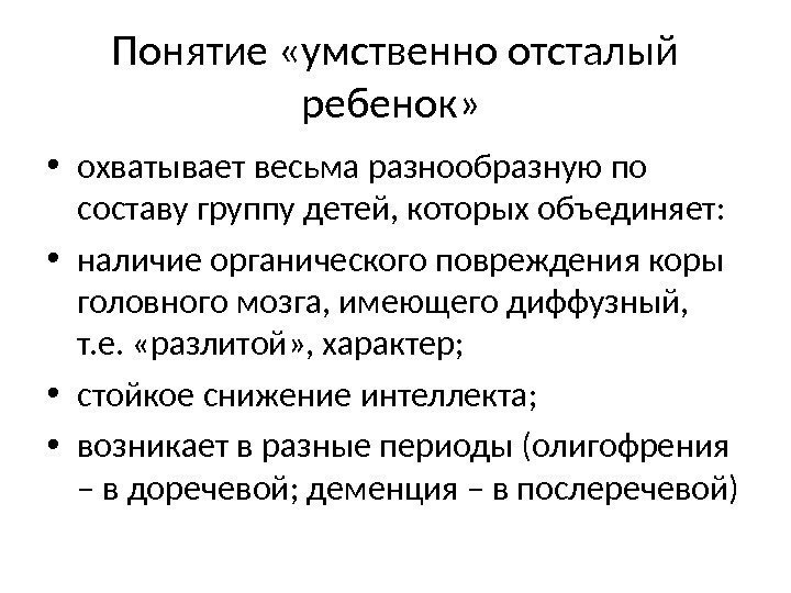 Понятие «умственно отсталый ребенок» • охватывает весьма разнообразную по составу группу детей, которых объединяет: • наличие органического повреждения коры головного мозга, имеющего диффузный, т. е. «разлитой» , характер; • стойкое снижение интеллекта; • возникает в разные периоды (олигофрения – в доречевой; деменция – в послеречевой)
