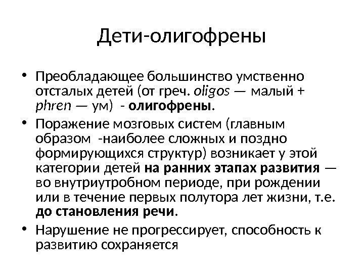 Дети-олигофрены • Преобладающее большинство умственно отсталых детей (от греч. oligos — малый + phren — ум) — олигофрены. • Поражение мозговых систем (главным образом -наиболее сложных и поздно формирующихся структур) возникает у этой категории детей на ранних этапах развития — во внутриутробном периоде, при рождении или в течение первых полутора лет жизни, т. е. до становления речи. • Нарушение не прогрессирует, способность к развитию сохраняется