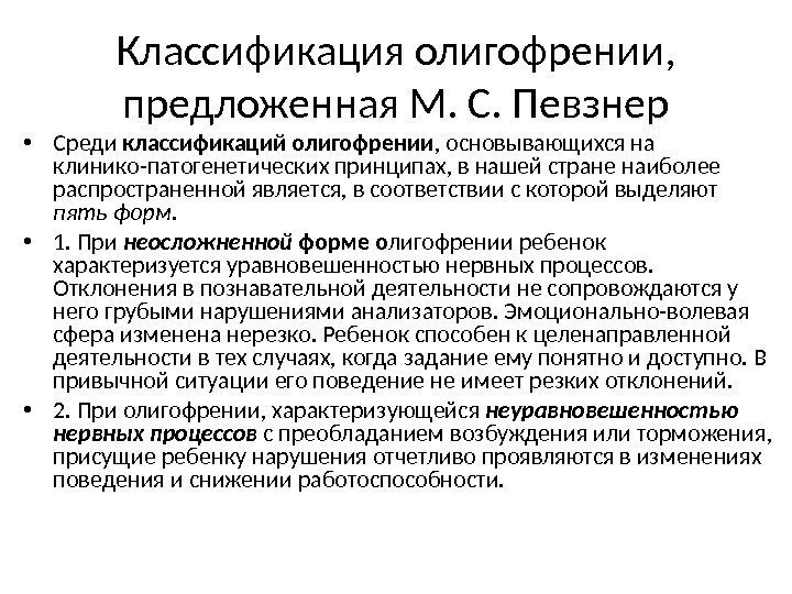 Классификация олигофрении, предложенная М. С. Певзнер • Среди классификаций олигофрении , основывающихся на клинико-патогенетических принципах, в нашей стране наиболее рас пространенной является, в соответствии с которой выделяют пять форм. • 1. При неосложненной форме о лигофрении ребенок характеризу ется уравновешенностью нервных процессов. Отклонения в по знавательной деятельности не сопровождаются у него грубыми нарушениями анализаторов. Эмоционально-волевая сфера изме нена нерезко. Ребенок способен к целенаправленной деятельно сти в тех случаях, когда задание ему понятно и доступно. В при вычной ситуации его поведение не имеет резких отклонений. • 2. При олигофрении, характеризующейся неуравновешенностью нервных процессов с преобладанием возбуждения или торможения, присущие ребенку нарушения отчетливо проявляются в измене ниях поведения и снижении работоспособности.