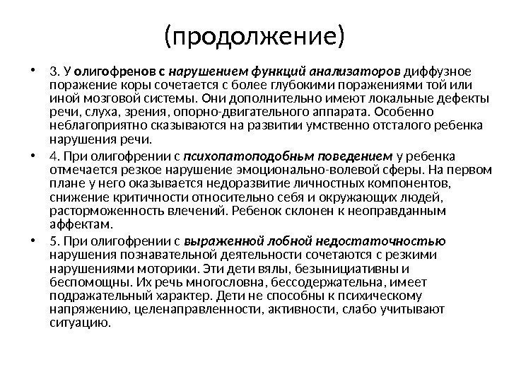 (продолжение) • 3. У олигофренов с нарушением функций анализаторов диффузное поражение коры сочетается с более глубокими поражениями той или иной мозговой системы. Они дополнительно имеют локаль ные дефекты речи, слуха, зрения, опорно-двигательного аппара та. Особенно неблагоприятно сказываются на развитии умственно отсталого ребенка нарушения речи. • 4. При олигофрении с психопатоподобньм поведением у ребенка отмечается резкое нарушение эмоционально-волевой сферы. На первом плане у него оказывается недоразвитие личностных ком понентов, снижение критичности относительно себя и окружаю щих людей, расторможенность влечений. Ребенок склонен к не оправданным аффектам. • 5. При олигофрении с выраженной лобной недостаточностью на рушения познавательной деятельности сочетаются с резкими нарушениями моторики. Эти дети вялы, безынициативны и беспомощны. Их речь многословна, бессодержательна, имеет подражательный характер. Дети не способны к психическому напряжению, целенаправлен ности, активности, слабо учитывают ситуацию.