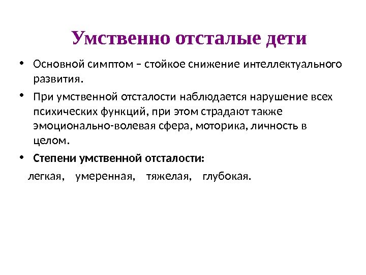 Умственно отсталые дети • Основной симптом – стойкое снижение интеллектуального развития. • При умственной отсталости наблюдается нарушение всех психических функций, при этом страдают также эмоционально-волевая сфера, моторика, личность в целом. • Степени умственной отсталости: легкая, умеренная, тяжелая, глубокая.