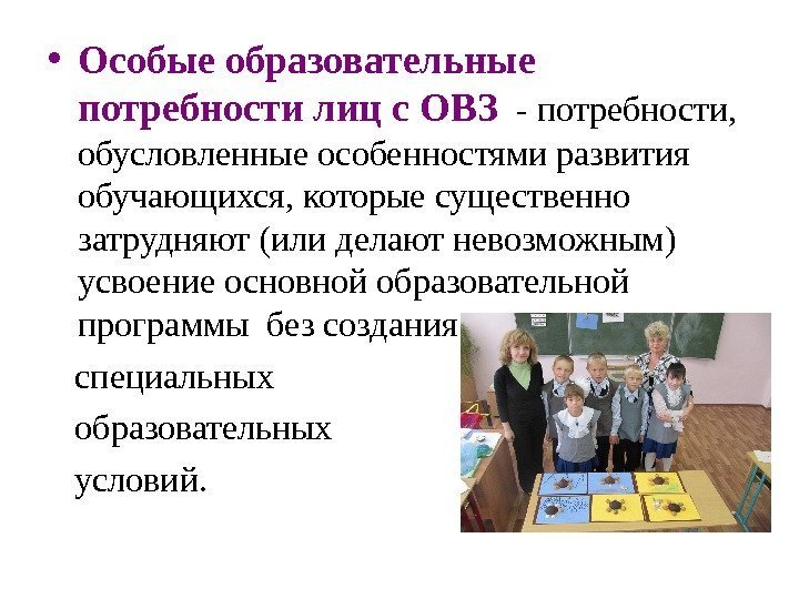 • Особые образовательные потребности лиц с ОВЗ — потребности, обусловленные особенностями развития обучающихся, которые существенно затрудняют (или делают невозможным) усвоение основной образовательной программы без создания специальных образовательных условий.