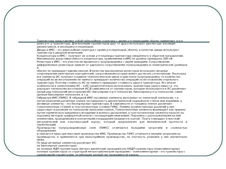 Классификация и основные характеристики ИМС Степень интеграции (плотность упаковки) является показателем сложности ИМ. Степень интеграции — это число простых элементов и компонентов входящих в состав ИМС. Количественно степень интеграции характеризуется числом K = lg N , где K – это степень интеграции, N – это число простых элементов в ИМС. По степени интеграции ИМС делятся на интегральные схемы: 1 -ой степени: К=1 N <=10 т. е. с числом элементов меньше 10; 2 -ой степени: К=2 N <=100; 3 -ой степени: К=3 N <=103 – их называют большие ИС т. е. БИС; 4 -ой степени: К=4 N 5 N <=105 — их называют сверхбольшие ИС т. е. СБИС. Сложность ИС характеризуется также плотностью упаковки , т. е числом элементов в единице обьема или на единице площади кристалла. По функциональному назначению ИМС делятся на аналоговые и цифровые. Аналоговые ИС (АИС) это микросхемы, которые предназначены для преобразования и обработки сигнала представленных в аналоговом виде. Это сигналы, которые описываются непрерывными функциями времени. В основе аналоговых схем лежит простейший усилительный каскад на основе которого строят другие устройства. В настоящее время под аналоговыми принято называть следующие операции: усиления, сравнения, ограничение, перемножение, частотная фильтрация. Цифровые ИС (ЦИС) это микросхемы, которые предназначены для преобразования и обработки сигналов, представленных в двоичном или другом цифровом коде. В основе цифровых схем лежит ключ и переключатель тока. Как правило, ИС разрабатываются и выпускаются изготовителями сериями. По технологии изготовления: полупроводниковые, гибридные (плёночные), а также совмещённые. Полупроводниковые ИМС (ПИМС). В них все элементы и межэлементные соединения выполнены в объёме и на поверхности кристалла проводника, т. е. полупроводниковые ИМС представляют собой кристалл полупроводника отдельные области которого выполняют функции транзистора, конденсатора, резистора и диода. Катушки индуктивности и конденсаторы с большой ёмкостью стараются не применять, поскольку они не выполнимы по интегральной технологии.
