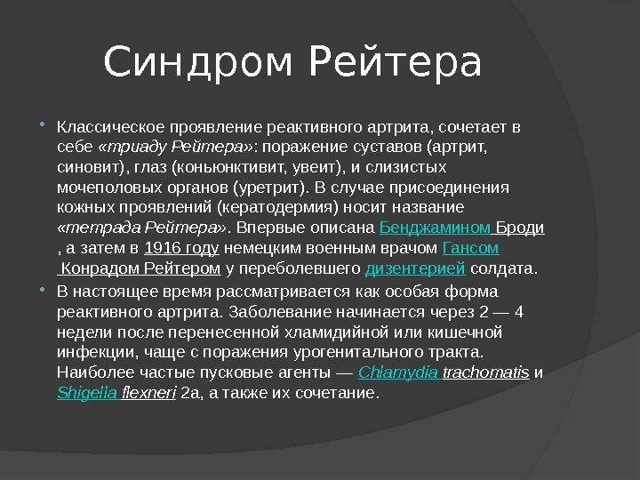 Синдром Рейтера Классическое проявление реактивного артрита, сочетает в себе «триаду Рейтера» : поражение суставов (артрит, синовит), глаз (коньюнктивит, увеит), и слизистых мочеполовых органов (уретрит). В случае присоединения кожных проявлений (кератодермия) носит название «тетрада Рейтера» . Впервые описана Бенджамином Броди , а затем в 1916 году немецким военным врачом Гансом Конрадом Рейтером у переболевшего дизентерией солдата. В настоящее время рассматривается как особая форма реактивного артрита. Заболевание начинается через 2 — 4 недели после перенесенной хламидийной или кишечной инфекции, чаще с поражения урогенитального тракта. Наиболее частые пусковые агенты — Chlamydia trachomatis и Shigella flexneri 2 а, а также их сочетание.