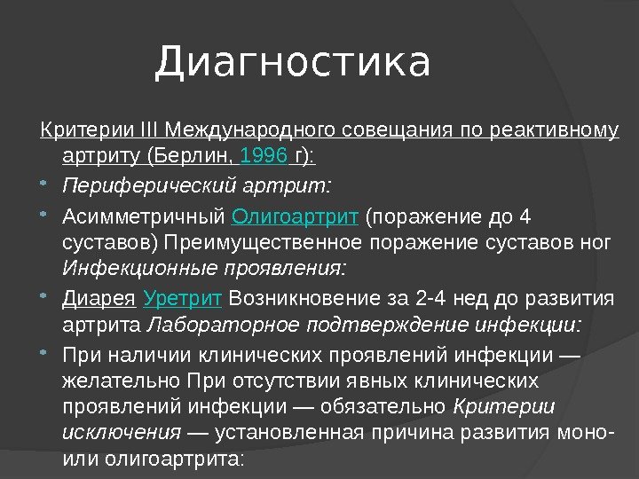 Диагностика Критерии III Международного совещания по реактивному артриту (Берлин, 1996 г): Периферический артрит: Асимметричный Олигоартрит (поражение до 4 суставов) Преимущественное поражение суставов ног Инфекционные проявления: Диарея Уретрит Возникновение за 2 -4 нед до развития артрита Лабораторное подтверждение инфекции: При наличии клинических проявлений инфекции — желательно При отсутствии явных клинических проявлений инфекции — обязательно Критерии исключения — установленная причина развития моно- или олигоартрита: