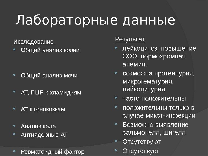 Лабораторные данные Исследование Общий анализ крови Общий анализ мочи АТ, ПЦР к хламидиям АТ к гонококкам Анализ кала Антиядерные АТ Ревматоидный фактор Результат лейкоцитоз, повышение СОЭ, нормохромная анемия. возможна протеинурия, микрогематурия, лейкоцитурия часто положительны только в случае микст-инфекции Возможно выявление сальмонелл, шигелл Отсутствуют Отсутствует
