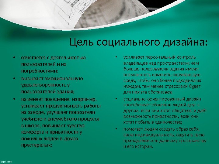 • сочетается с деятельностью пользователей и их потребностями; • вызывает эмоциональную удовлетворенность у пользователей здания; • изменяет поведение, например, усиливает продуктивность работы на заводе, улучшает показатели учебного и внеучебного процесса в школе, повышает чувство комфорта и приватности у пожилых людей в домах престарелых; • усиливает персональный контроль владельцев над пространством: чем больше пользователи здания имеют возможность изменять окружающую среду, чтобы она более подходила их нуждам, тем менее стрессовой будет для них эта обстановка; • социально-ориентированный дизайн способствует общению людей друг с другом, если они хотят общаться, и даёт возможность приватности, если они хотят побыть в одиночестве; • помогает людям создать образ себя, свою индивидуальность, ощутить свою принадлежность данному пространству и его истории. Цель социального дизайна: