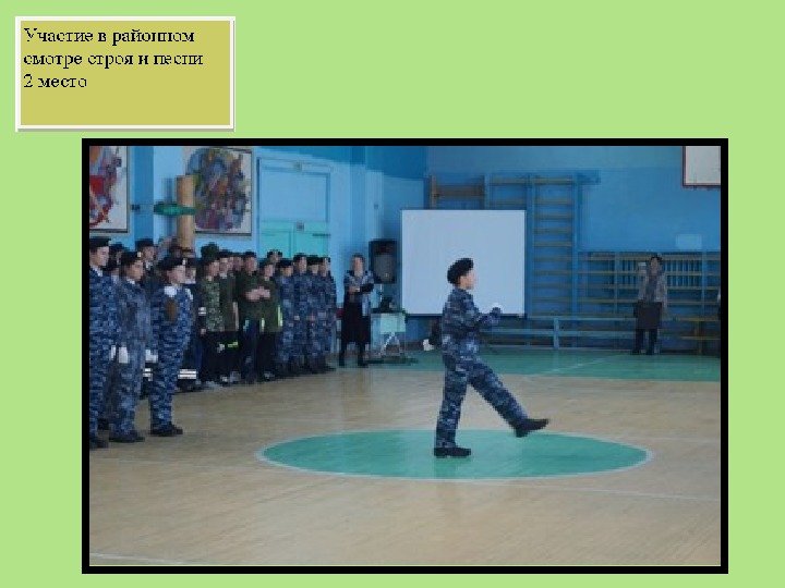 1, 2, 3 день сборов проводился на базе школы 4 день—экскурсия всех учащихся —юношей 10 классов района в в/ч 83497 (г. Ярославль) 5 день — заключительный районный прошел на базе нашей школы в виде соревнований (принимали участие все учащиеся района)