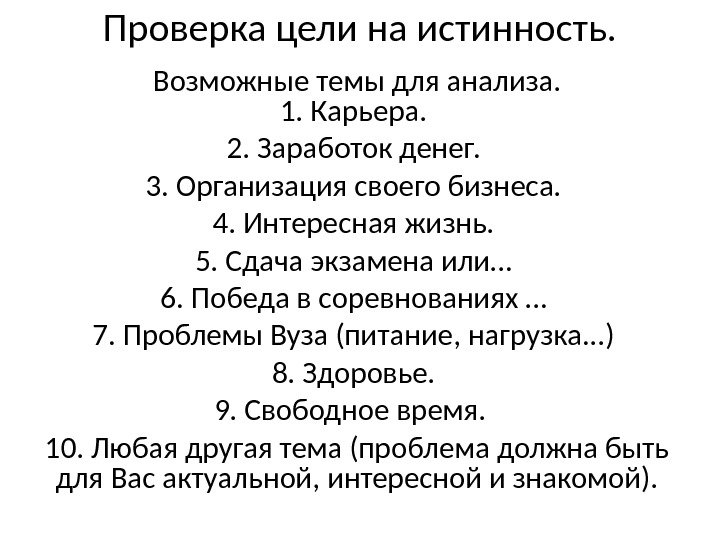Проверка цели на истинность. Возможные темы для анализа. 1. Карьера. 2. Заработок денег. 3. Организация своего бизнеса. 4. Интересная жизнь. 5. Сдача экзамена или… 6. Победа в соревнованиях … 7. Проблемы Вуза (питание, нагрузка. . . ) 8. Здоровье. 9. Свободное время. 10. Любая другая тема (проблема должна быть для Вас актуальной, интересной и знакомой).