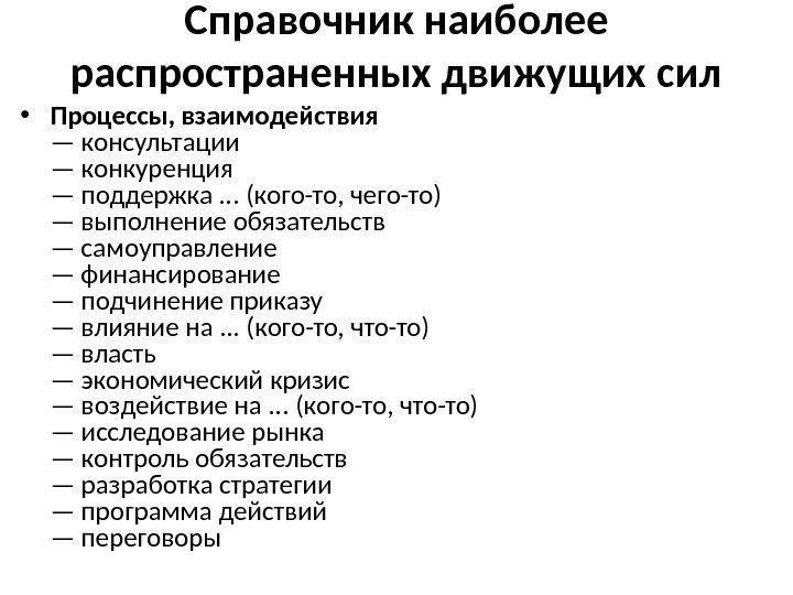 Справочник наиболее распространенных движущих сил • Процессы, взаимодействия — консультации — конкуренция — поддержка. . . (кого-то, чего-то) — выполнение обязательств — самоуправление — финансирование — подчинение приказу — влияние на. . . (кого-то, что-то) — власть — экономический кризис — воздействие на. . . (кого-то, что-то) — исследование рынка — контроль обязательств — разработка стратегии — программа действий — переговоры