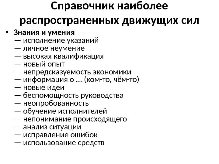 Справочник наиболее распространенных движущих сил • Знания и умения — исполнение указаний — личное неумение — высокая квалификация — новый опыт — непредсказуемость экономики — информация о. . . (ком-то, чём-то) — новые идеи — беспомощность руководства — неопробованность — обучение исполнителей — непонимание происходящего — анализ ситуации — исправление ошибок — использование средств