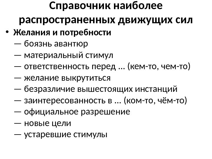 Справочник наиболее распространенных движущих сил • Желания и потребности — боязнь авантюр — материальный стимул — ответственность перед. . . (кем-то, чем-то) — желание выкрутиться — безразличие вышестоящих инстанций — заинтересованность в. . . (ком-то, чём-то) — официальное разрешение — новые цели — устаревшие стимулы
