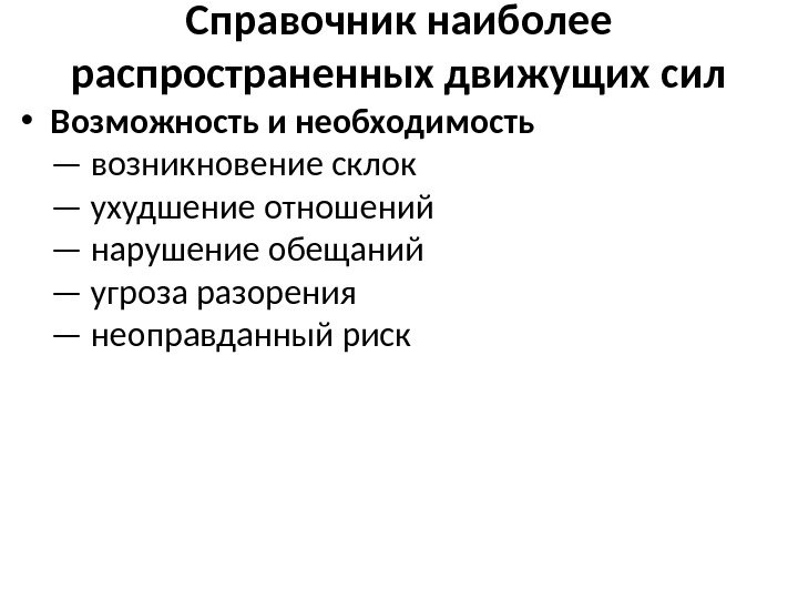 Справочник наиболее распространенных движущих сил • Возможность и необходимость — возникновение склок — ухудшение отношений — нарушение обещаний — угроза разорения — неоправданный риск