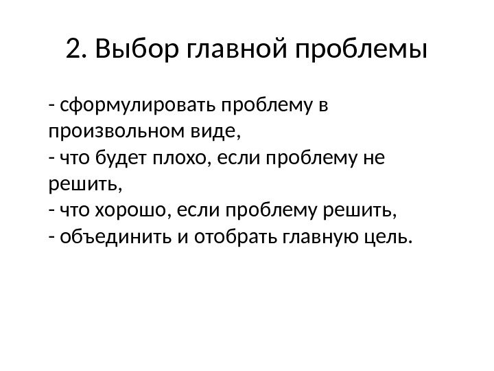 2. Выбор главной проблемы — сформулировать проблему в произвольном виде, — что будет плохо, если проблему не решить, — что хорошо, если проблему решить, — объединить и отобрать главную цель.