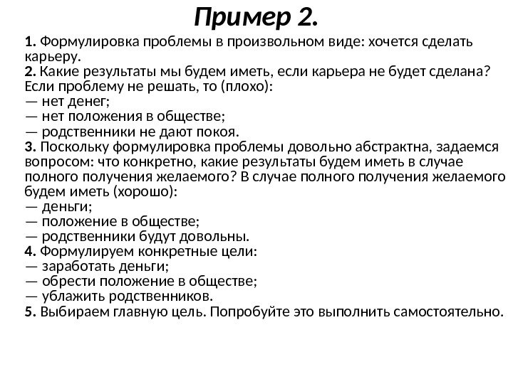 Пример 2. 1. Формулировка проблемы в произвольном виде: хочется сделать карьеру. 2. Какие результаты мы будем иметь, если карьера не будет сделана? Если проблему не решать, то (плохо): — нет денег; — нет положения в обществе; — родственники не дают покоя. 3. Поскольку формулировка проблемы довольно абстрактна, задаемся вопросом: что конкретно, какие результаты будем иметь в случае полного получения желаемого? В случае полного получения желаемого будем иметь (хорошо): — деньги; — положение в обществе; — родственники будут довольны. 4. Формулируем конкретные цели: — заработать деньги; — обрести положение в обществе; — ублажить родственников. 5. Выбираем главную цель. Попробуйте это выполнить самостоятельно.