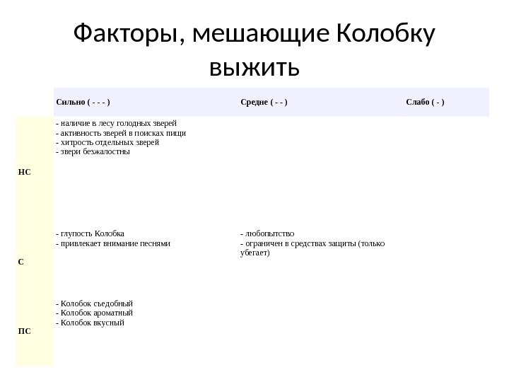 Факторы, мешающие Колобку выжить Сильно ( — — — ) Средне ( — — ) Слабо ( — ) НС -наличиевлесуголодныхзверей -активностьзверейвпоискахпищи -хитростьотдельныхзверей -зверибезжалостны С -глупость. Колобка -привлекаетвниманиепеснями -любопытство -ограниченвсредствахзащиты(только убегает) ПС -Колобоксъедобный -Колобокароматный -Колобоквкусный
