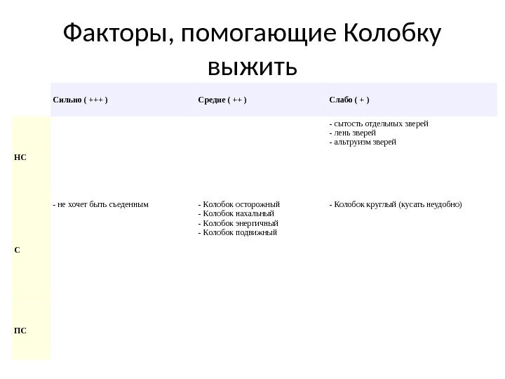 Факторы, помогающие Колобку выжить Сильно ( +++ ) Средне ( ++ ) Слабо ( + ) НС -сытостьотдельныхзверей -леньзверей -альтруизмзверей С -нехочетбытьсъеденным -Колобокосторожный -Колобокнахальный -Колобокэнергичный -Колобокподвижный -Колобоккруглый(кусатьнеудобно) ПС