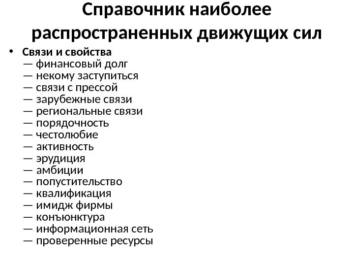 Справочник наиболее распространенных движущих сил • Связи и свойства — финансовый долг — некому заступиться — связи с прессой — зарубежные связи — региональные связи — порядочность — честолюбие — активность — эрудиция — амбиции — попустительство — квалификация — имидж фирмы — конъюнктура — информационная сеть — проверенные ресурсы