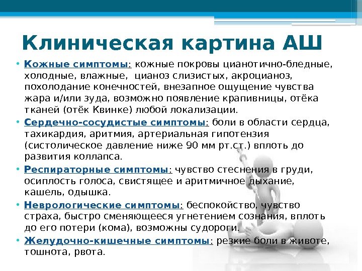 Клиническая картина АШ • Кожные симптомы : кожные покровы цианотично-бледные, холодные, влажные, цианоз слизистых, акроцианоз, похолодание конечностей, внезапное ощущение чувства жара и/или зуда, возможно появление крапивницы, отёка тканей (отёк Квинке) любой локализации. • Сердечно-сосудистые симптомы : боли в области сердца, тахикардия, аритмия, артериальная гипотензия (систолическое давление ниже 90 мм рт. ст. ) вплоть до развития коллапса. • Респираторные симптомы : чувство стеснения в груди, осиплость голоса, свистящее и аритмичное дыхание, кашель, одышка. • Неврологические симптомы : беспокойство, чувство страха, быстро сменяющееся угнетением сознания, вплоть до его потери (кома), возможны судороги. • Желудочно-кишечные симптомы : резкие боли в животе, тошнота, рвота.