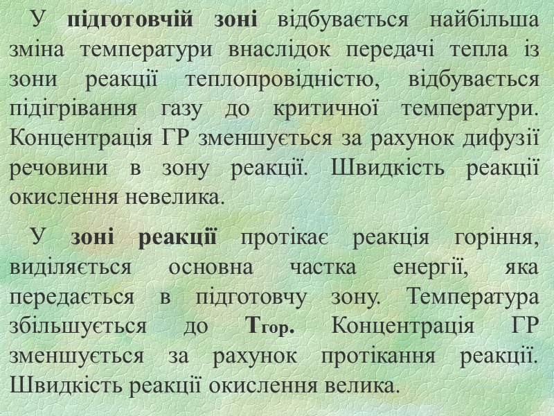 У підготовчій зоні відбувається найбільша зміна температури внаслідок передачі тепла із зони реакції теплопровідністю, відбувається підігрівання газу до критичної температури. Концентрація ГР зменшується за рахунок дифузії речовини в зону реакції. Швидкість реакції окислення невелика. У зоні реакції протікає реакція горіння, виділяється основна частка енергії, яка передається в підготовчу зону. Температура збільшується до Тгор. Концентрація ГР зменшується за рахунок протікання реакції. Швидкість реакції окислення велика.
